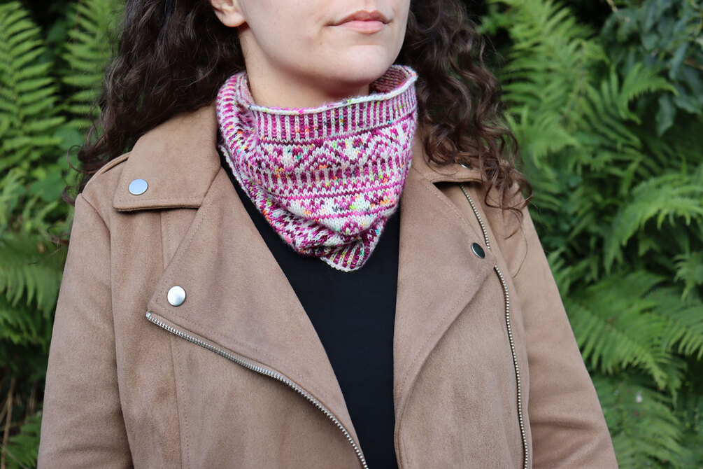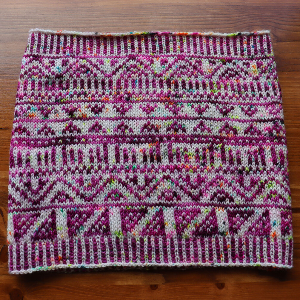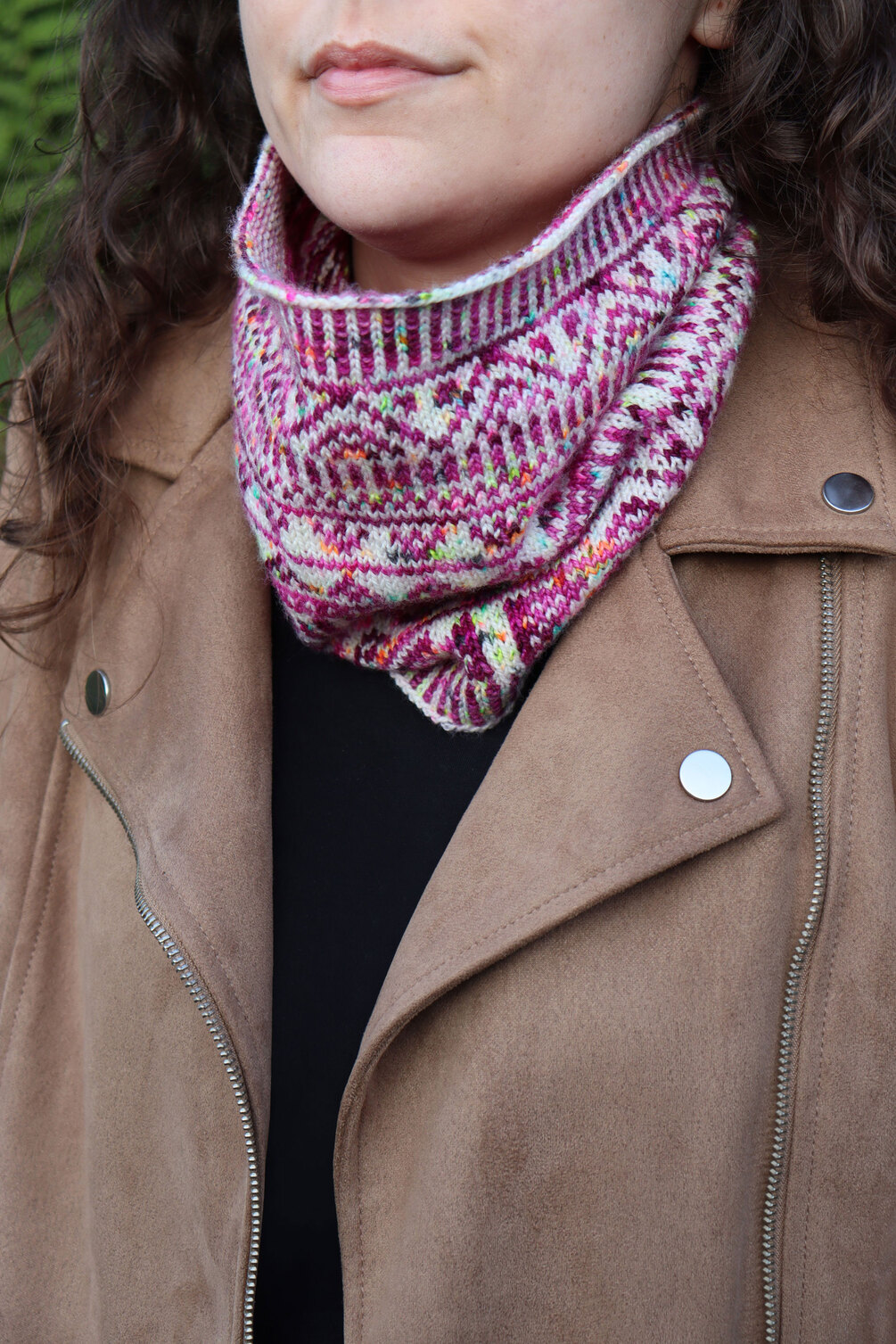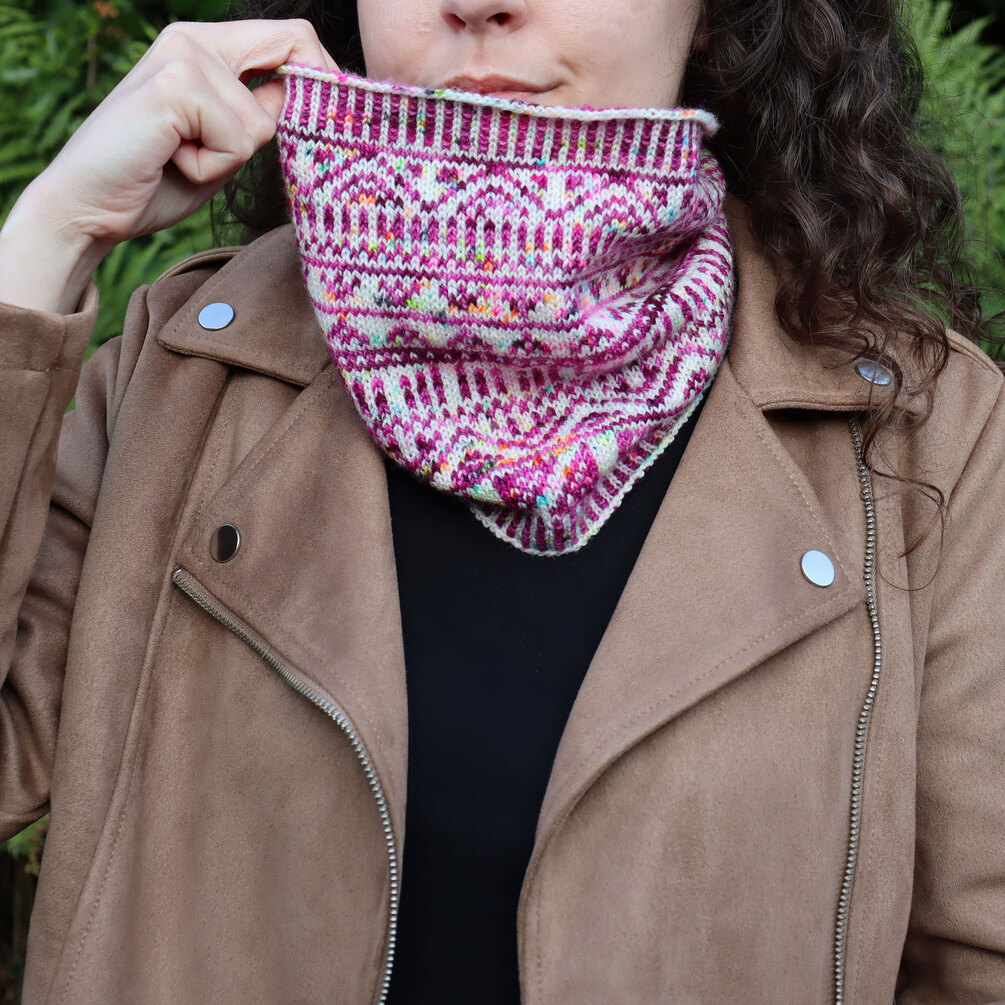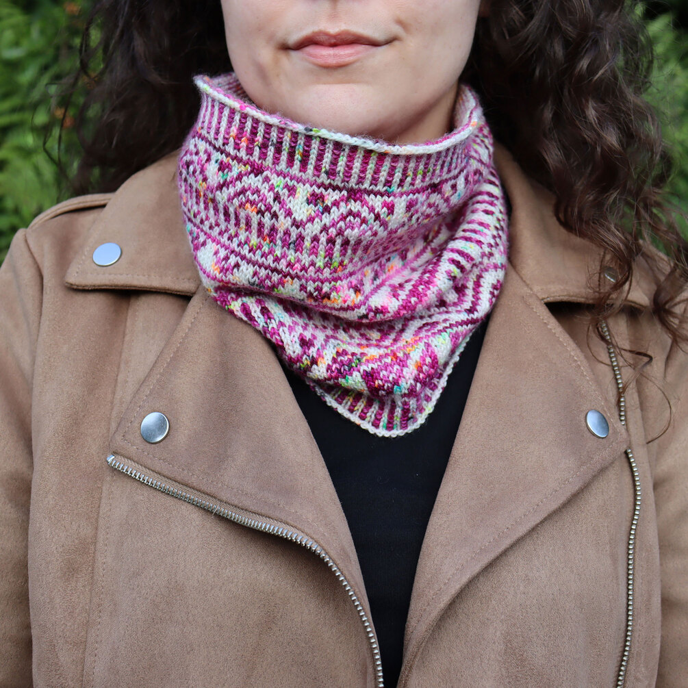 Covered with detailed colourwork, the Point Cowl’s design features sections of lines and triangles. The colourwork changes as you progress through the cowl, keeping the project interesting and difficult to put down.