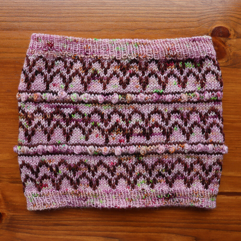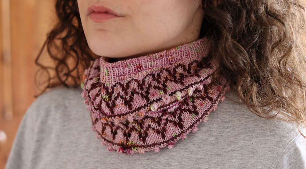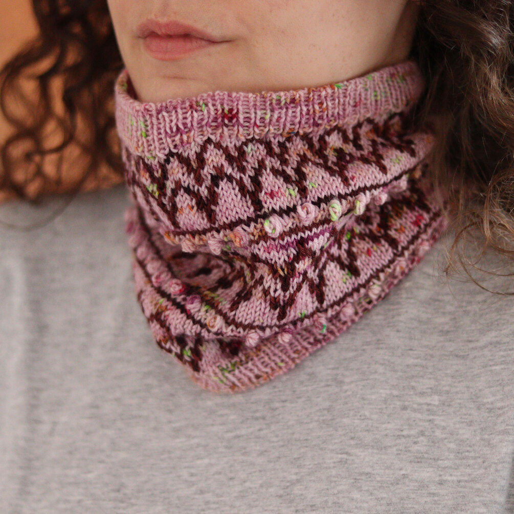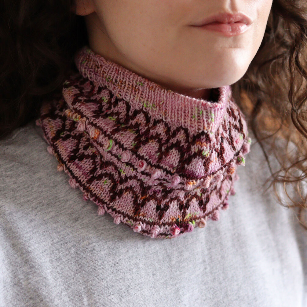 Inspired by feathers, the Soar Cowl features sections of colourwork separated by bands of bobbles. This varied and engaging project includes simple stranded colourwork with no long floats, textured rows of bobbles, as well as short breaks of relaxing plain stockinette stitch.