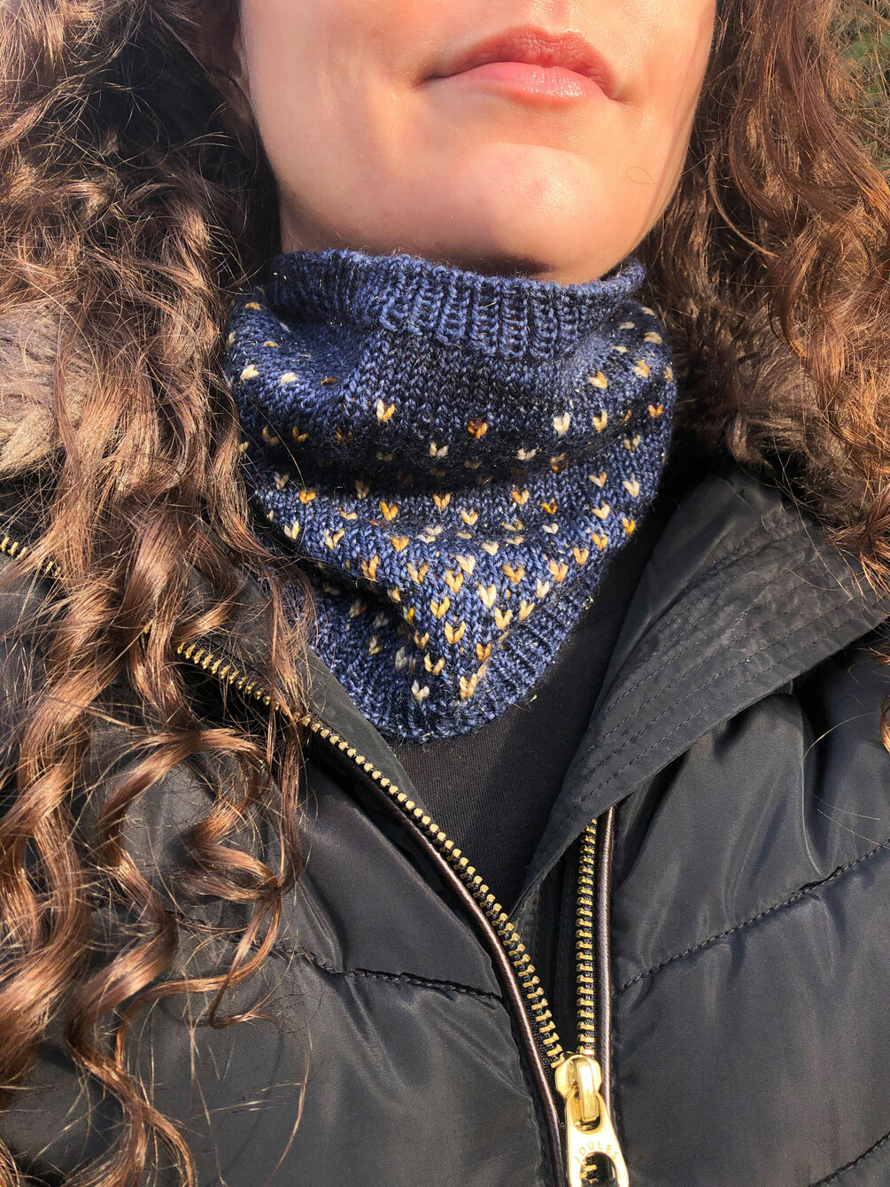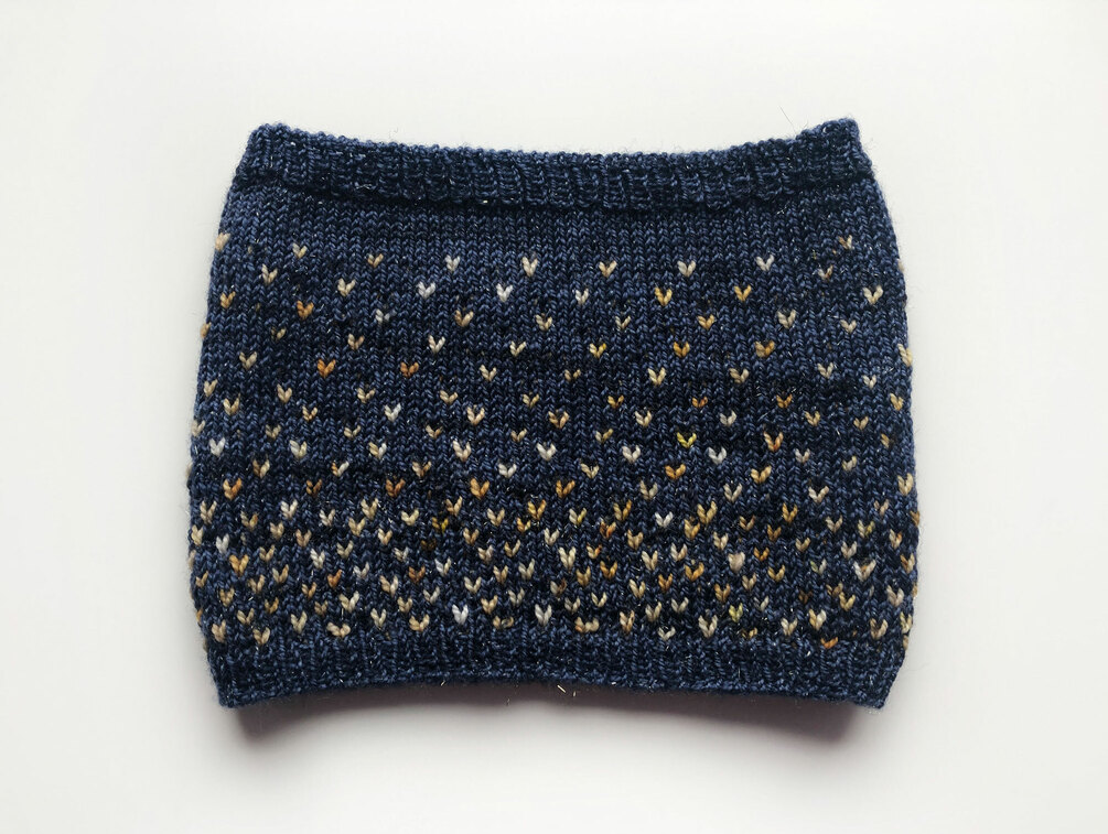 A simple colourwork cowl inspired by the night sky. The stars decrease in density from the start to the end of the cowl, choose colours to either mimic the sky and stars or something completely different. With short and simple repeats this pattern is easy to follow, even for people who are totally new to stranded colourwork.