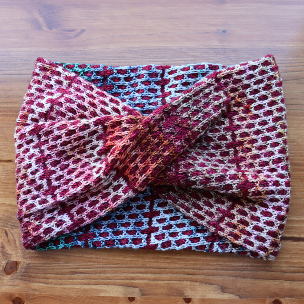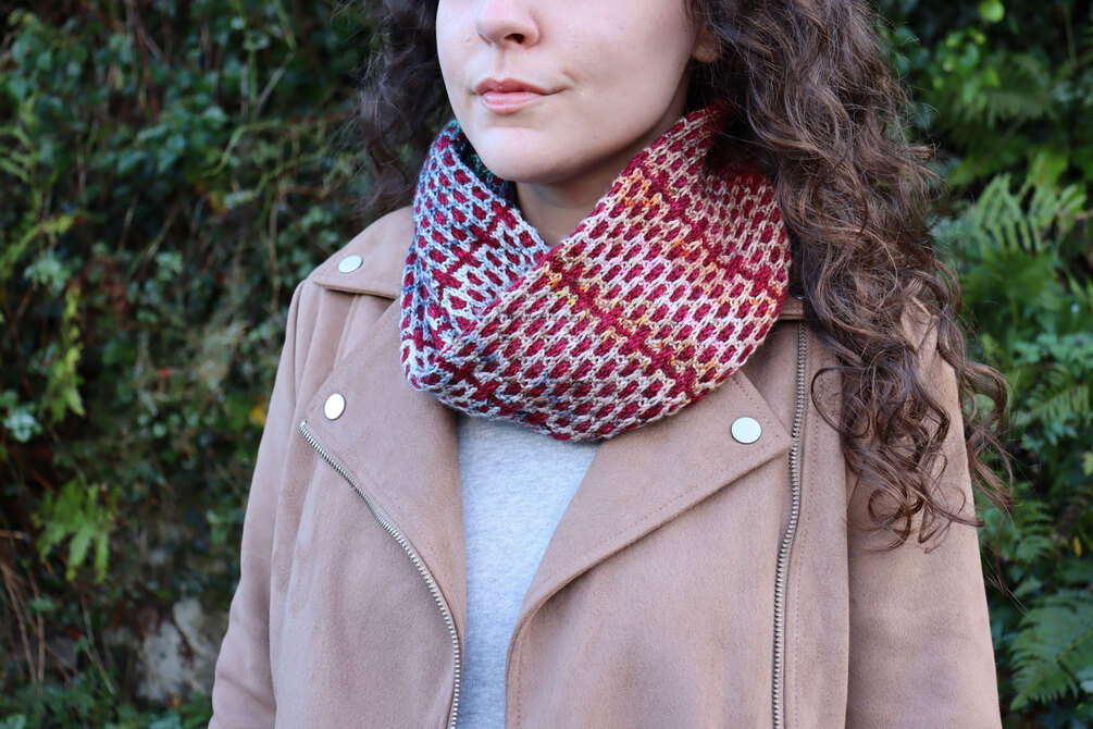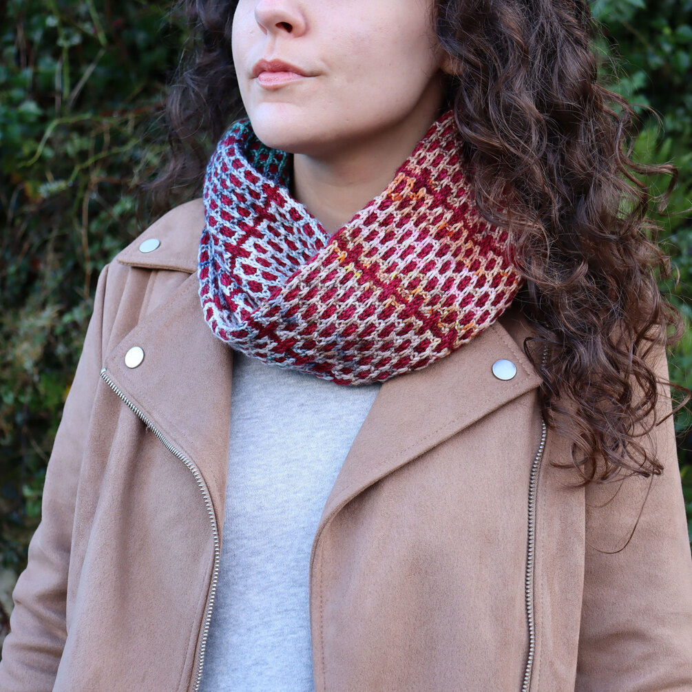Inspired by the appearance of brickwork, the Compose Cowl uses mosaic knitting to create a möbius cowl covered with a detailed brick pattern. The cowl can be knit with just two colours, but can also be perfect for using advent yarn, mini skeins or using up scraps of yarn.